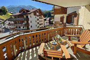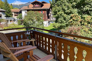 Grosser Balkon Richtung Osten mit herrlicher Aussicht auf die umliegende Dorf- und Berglandschaft.